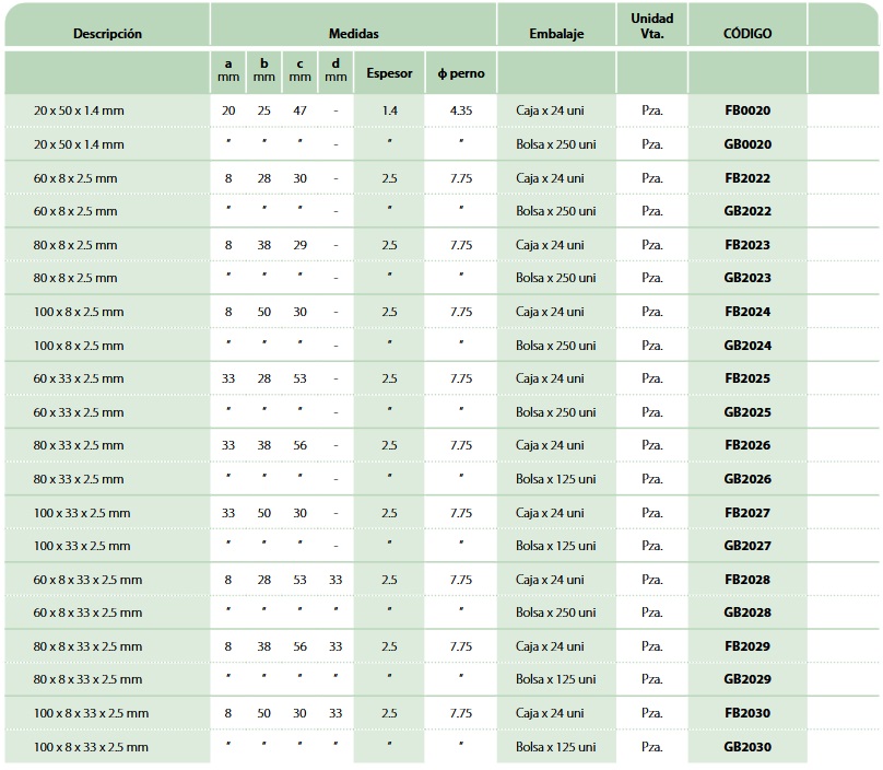 Material: • De chapa de hierro y perno de hierro trefilado estampado SAE 1010. • En cajas de cartón conteniendo 24 unidades (derechas o izquierdas)