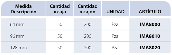 • En cajas conteniendo 50 pzas. • En cajón de cartón conteniendo 200 pzas. C/TORNILLOS