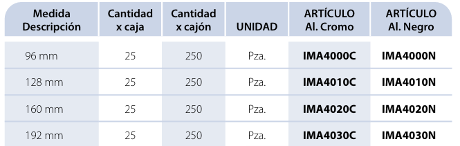 Embalaje: • En cajas conteniendo 25 pzas. • En cajón de cartón cerrado 250 pzas. C/TORNILLOS