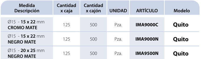 Embalaje: • En cajas conteniendo 50 pzas. • En cajón de cartón conteniendo 500 pzas.