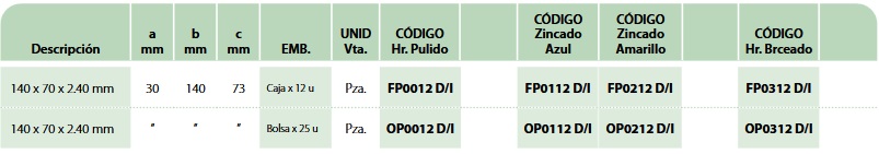 Material: • De chapa de hierro decapada y perno de hierro trefilado estampado SAE 1010, con arandelas bronceadas. • El zincado puede ser amarillo o azul. Otras terminaciones (ej.: zincado negro) consultar.