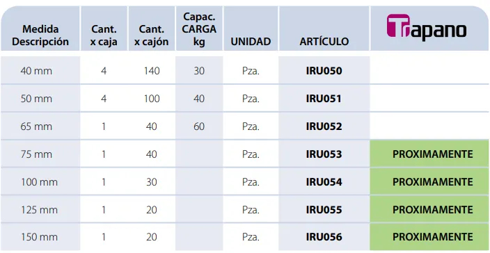 Embalaje: • En cajas de cartón y sueltas. • A Artículos por Cajón cerrado llevan descuento, ver Lista de Precios. (cantidad mínima de venta es la caja)
