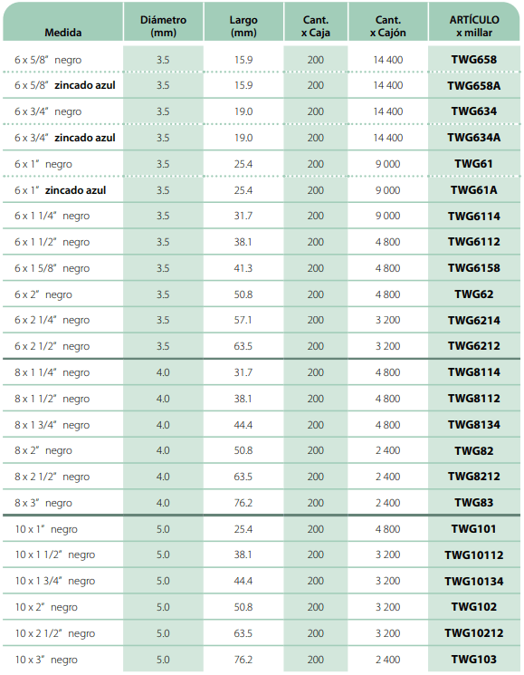 Embalaje: • En cajas de 200 piezas o Cajón. • Artículos por Cajón cerrado llevan descuento, ver Lista de Precios. • Precios por millar (1000)